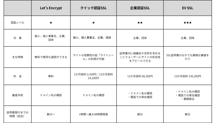 一方、独自SSL(有料)の証明書は、GMOグローバルサイン株式会社が提供しているクイック認証SSL、企業認証SSL、EV SSLです。